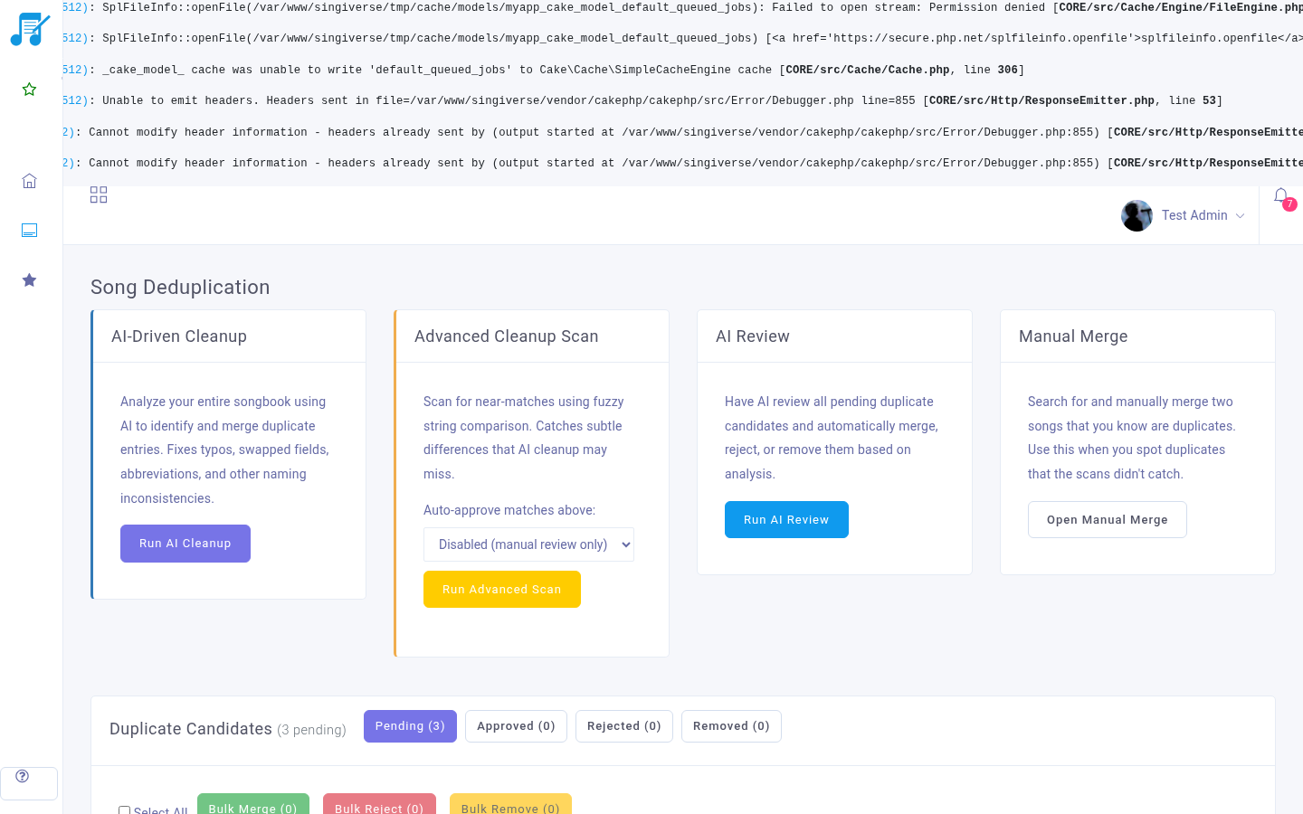 Our AI engine analyzes your songbook and identifies duplicate entries, even when spellings differ. It presents candidates for review so you stay in control — merge duplicates with one click, or dismiss false matches. Premium plan only.