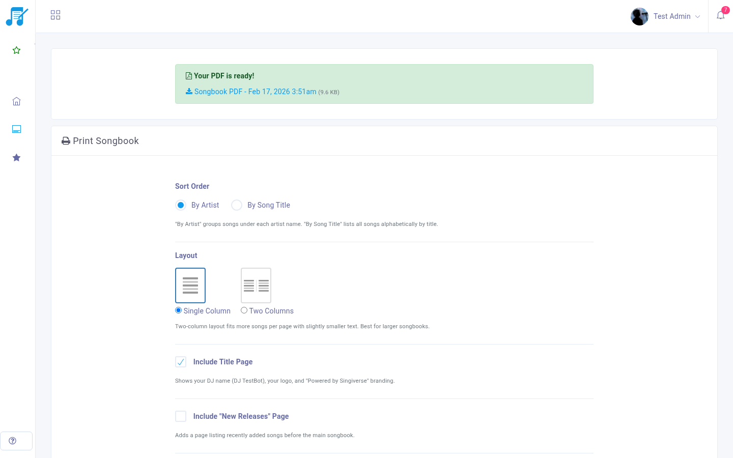 Generate beautiful, print-ready PDF songbooks directly from your online library. Perfect for venues that want physical books alongside the digital kiosk experience.